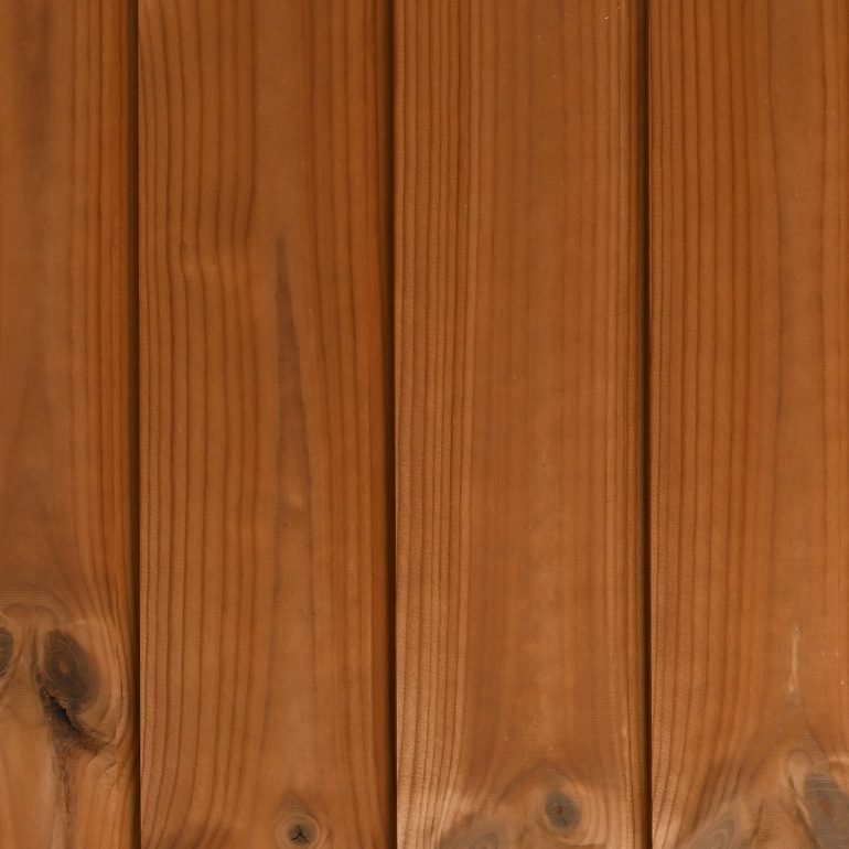 Fyrretræet har en smuk og brun glød og har de karakteristiske lange åretegninger og knaster. Thermo fyr beklædningsbrædder patinerer smukt med en sølvgrå farve såfremt den ikke oliereres. Rustik kvalitet med ubegrænset knast er tilladt i denne træsort.