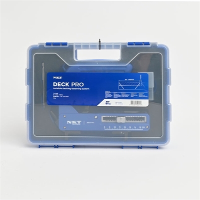 NKT Deck Pro værktøjet kan nemt justeres til terrassebrædder med en bredde på 85-150 mm. Det leveres i en praktisk opbevaringskasse, komplet med værktøj, bits og udskiftelige spacers i tykkelser fra 3-7 mm, så du kan vælge præcis den afstand mellem brædderne, der passer til dit projekt.